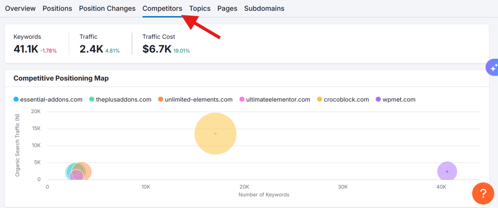 Enter your domain into the tool. And click “Search.” On the report that appears, click “Competitors.”
