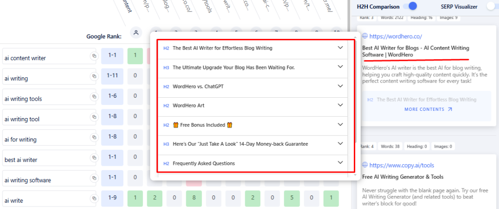 As shown above, for the keyword “ai content writer”, the user’s content has used it ideally, once (marked in green). But Hubspot and WordHero’s content have overused it (shown in red). 0 with no color means not used at all.
